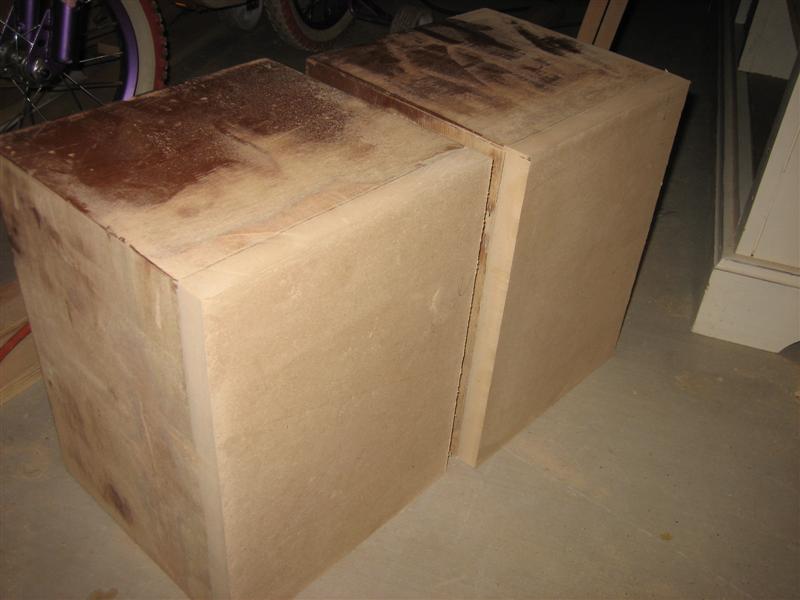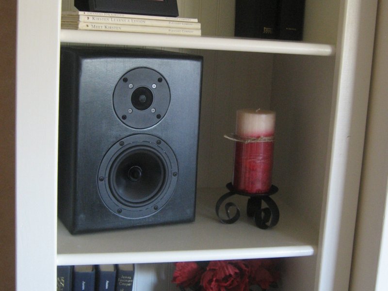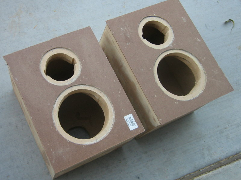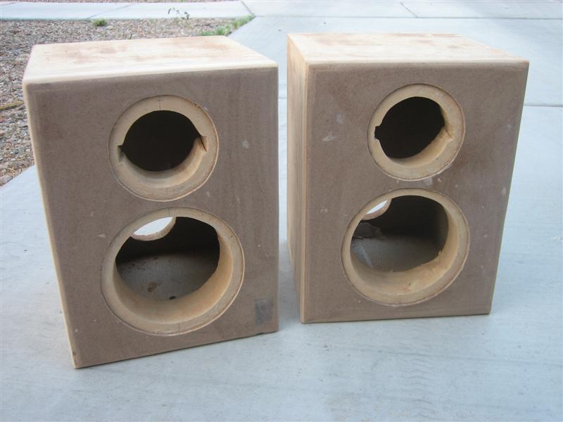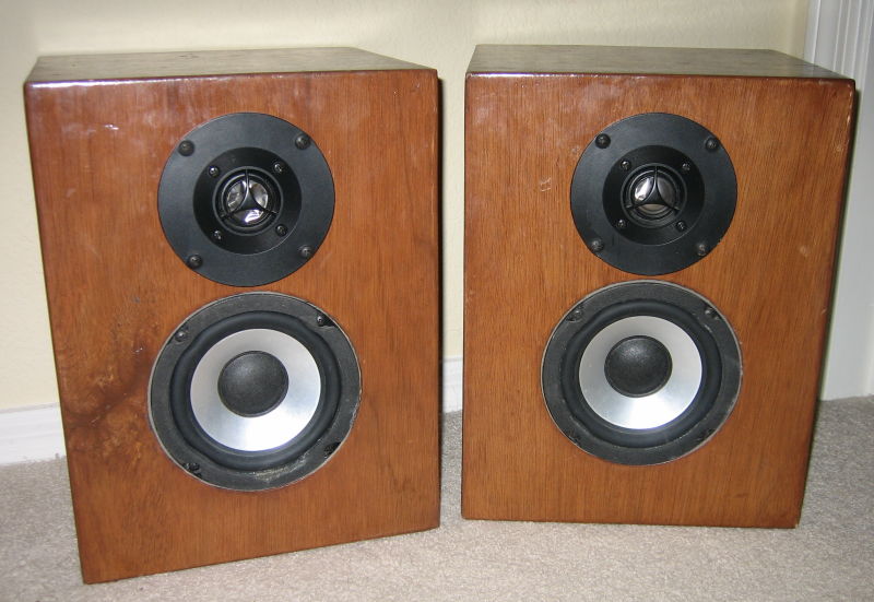 I finally finished a new pair of 2-way bookshelf speakers for my home theater, a project that started over two years ago. It was back in March of 2006 that I bought a pair of Dayton RS-150S-8 6" Reference Series woofers and RS-28A-4 tweeters. The plan was to refinish an old pair of speakers that had some old MCM speakers in them that weren't worth the time I spent on the nice enclosures that housed them. They never sounded very good, and the tweeters somehow got completely destroyed, in spite of the plastic shield that was suppose to protect them. So I picked the new speakers to drop in to the old cabinets in hopes of doing it with little modifications.